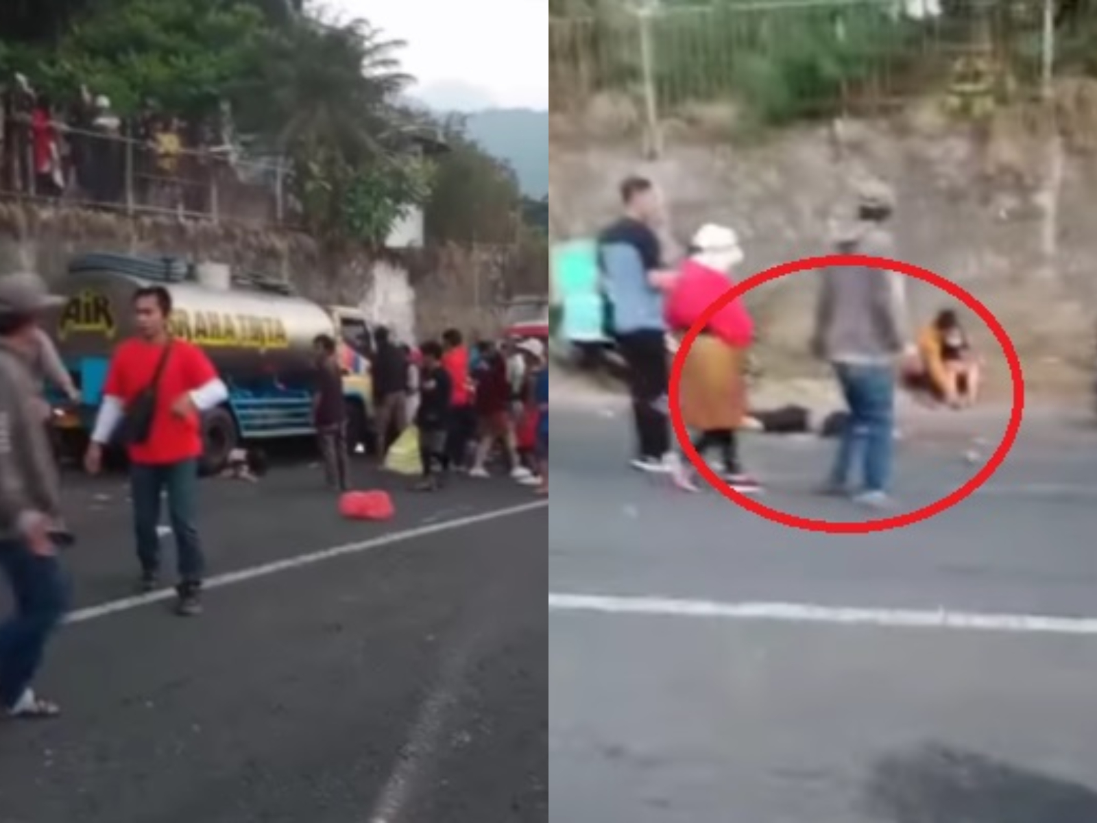 Pada saat yang bersamaan, warga yang selamat terlihat berkumpul di sekitar truk yang telah berhenti di tepi jalan. Seorang petugas polisi terlihat berusaha menenangkan orang-orang yang mulai terpancing emosi.